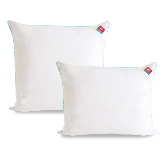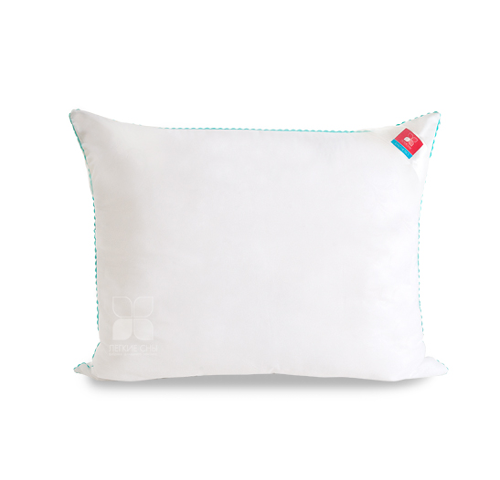 Важно заметить, что синтетический пух столь же лёгок и приятен на ощупь, как и его натуральный прототип. Чехол подушки выполнен из микрофибры (100 % полиэстр) белого цвета с тиснением страйп или волны, отделка по краю подушки кантом зиг-заг бирюзового цвета, фирменная упаковка конверт ПВД, спанбонд.