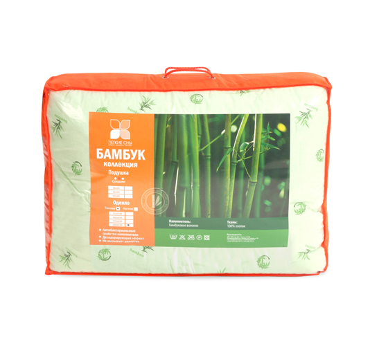 Особенностью одеяла является стеганый чехол, что не позволяет наполнителю скатываться в комки. В качестве наполнителя используется искусственный «лебяжий пух» и бамбуковое волокно, одеяло выполнено из ткани поплин (100% хлопок) салатового цвета с бамбуковым рисунком, фирменная упаковка конверт ПВД, спанбонд.