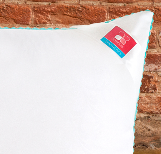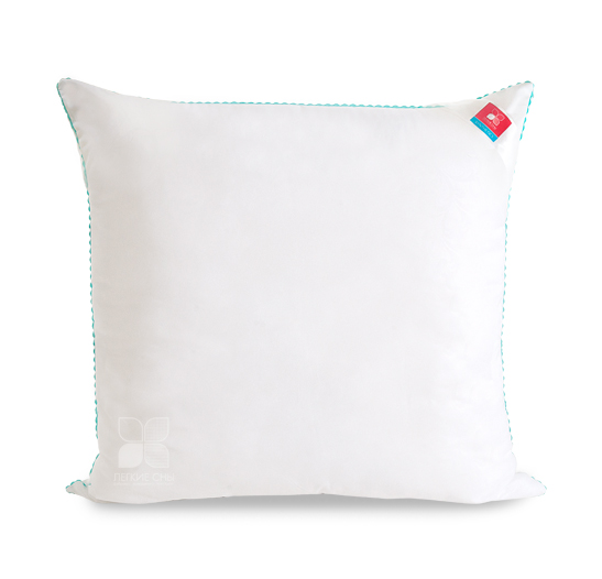 Важно заметить, что синтетический пух столь же лёгок и приятен на ощупь, как и его натуральный прототип. Чехол подушки выполнен из микрофибры (100 % полиэстр) белого цвета с тиснением страйп или волны, отделка по краю подушки кантом зиг-заг бирюзового цвета, фирменная упаковка конверт ПВД, спанбонд.
