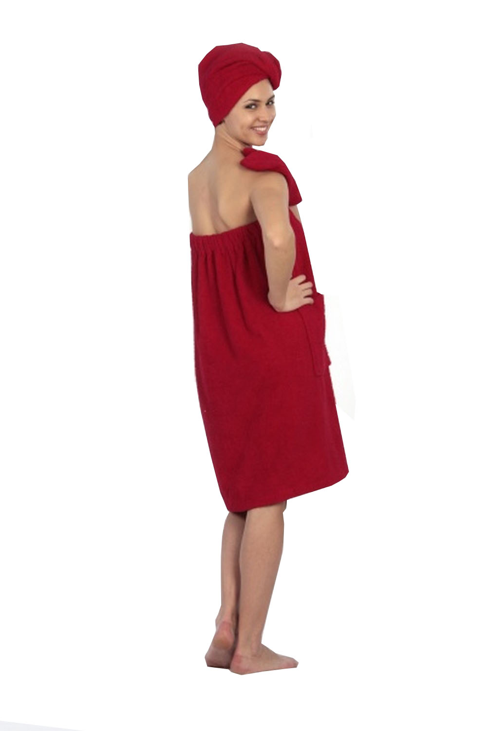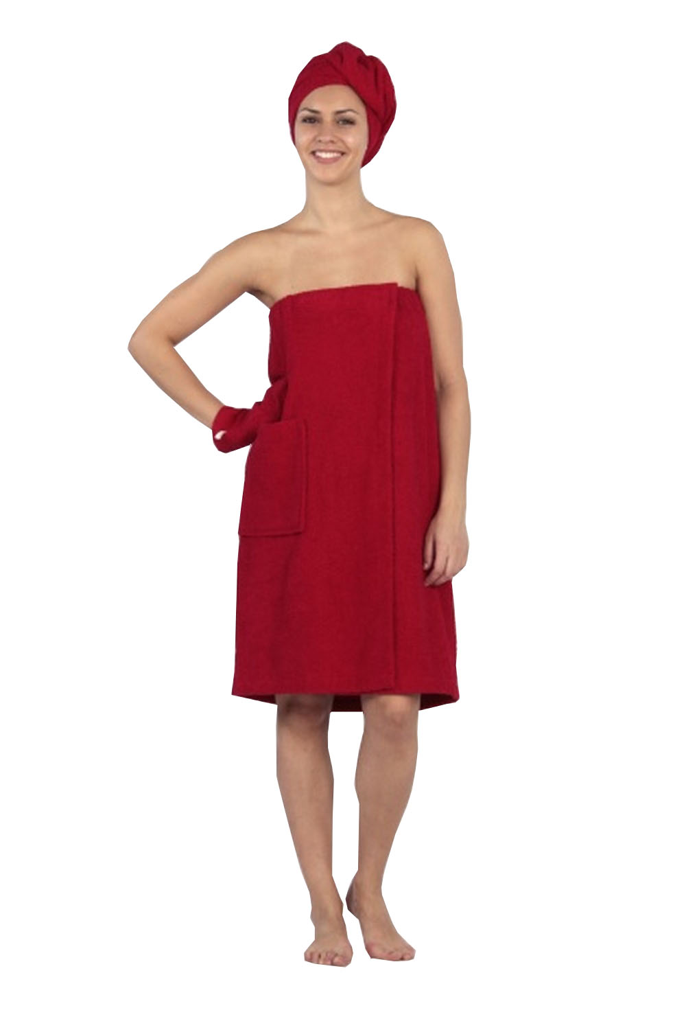 САУНА (БАННЫЙ КОМПЛЕКТ) МОНИКА включает в себя чалму, юбку и рукавицу.  Рукавичка предназначена для безопасного прикосновения к горячим предметам ковшам, тазам. Но чаще всего ей пользуются для массажа тела.  Специально пошитая юбка заменит неудобное полотенце, которое постоянно нужно придерживать рукой, чтобы не сползало. Все предметы, которые входят в банный комплект изготовлены из натуральных природных материалов. Купить Банный комплект для сауны Моника на нашем сайте можно в различных расцветках.